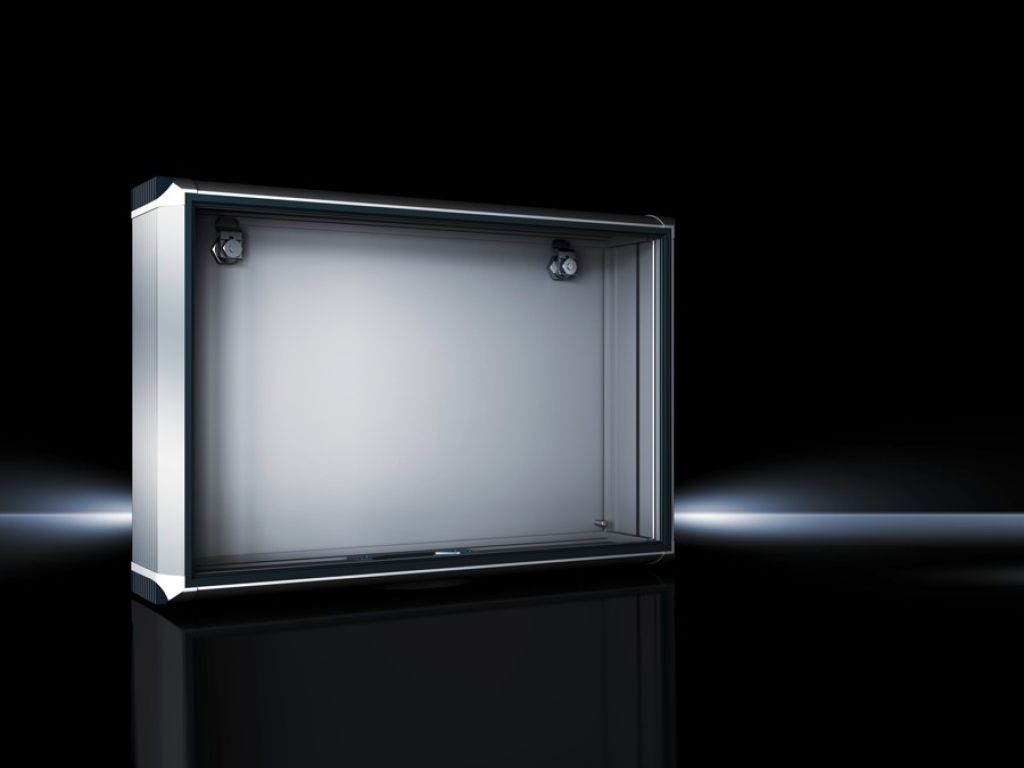 Rittal 3383510 3383 510 toptherm blue roof mounted cooling unit features a nano coated condenser a integral electric condensate evaporation drilling template and assembly parts.